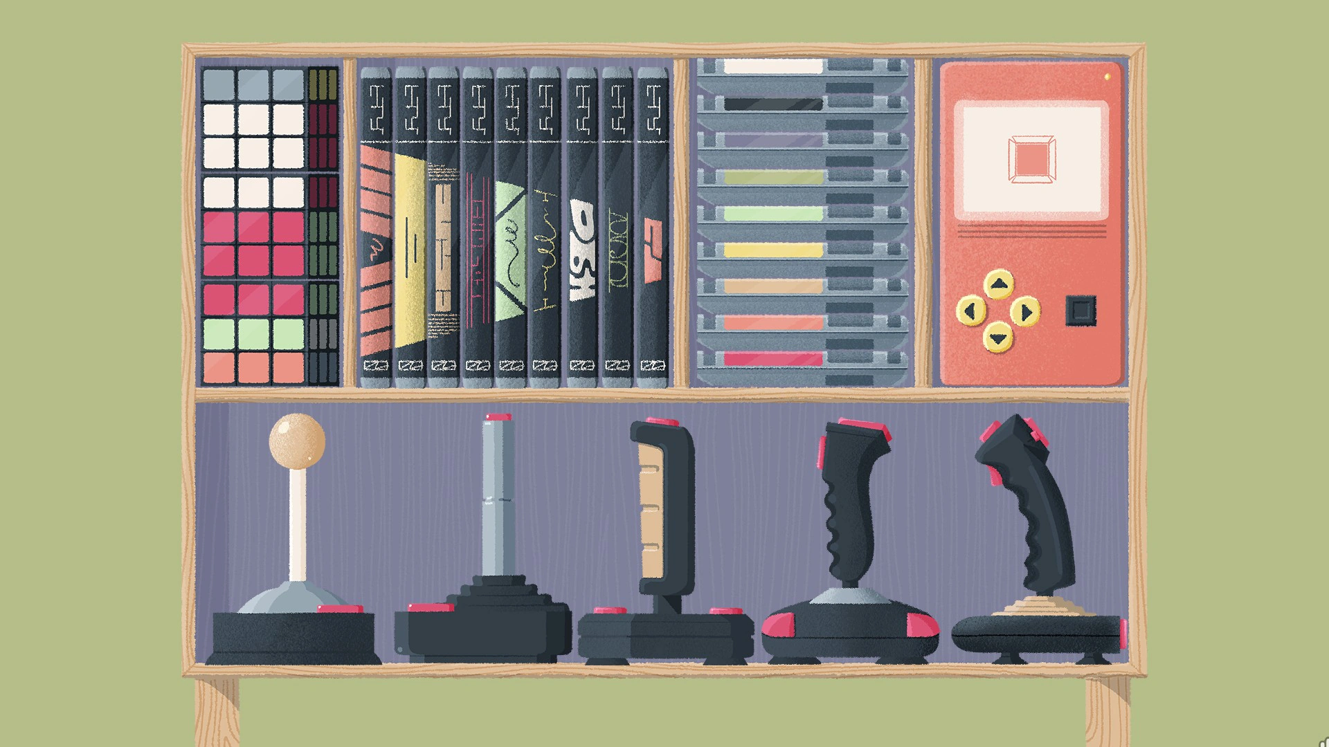 This level has a cupboard with Rubik's cubes, consoles, and joysticks.